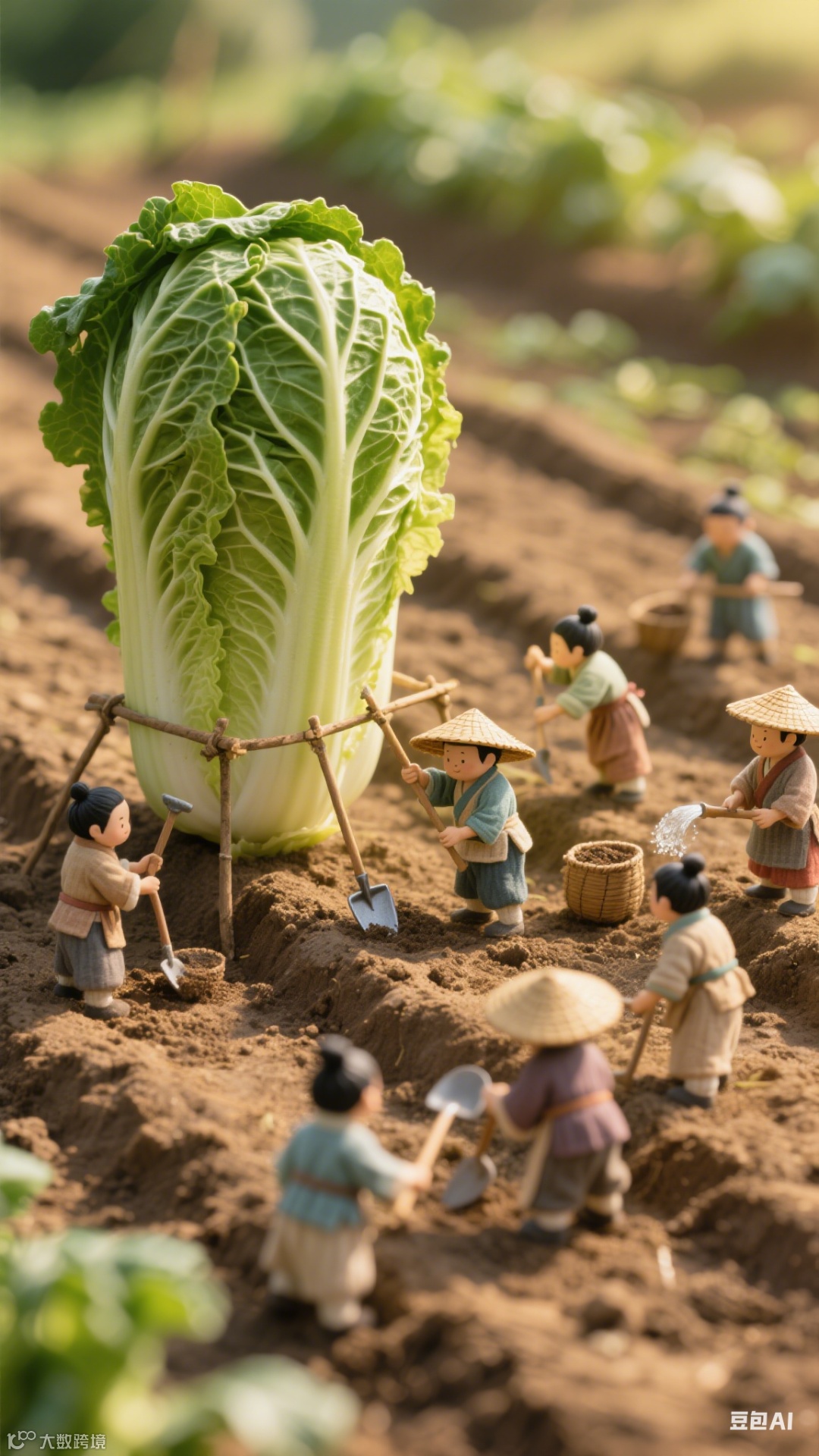 比如:微缩世界景观,小人国,微距拍摄。一群穿着古装的小人,正在农田里种着一颗比人大很多的白菜。画面呈现温馨的生活气息,精致的细节,清晰的纹理,超清的质感。,比例 「9:16」