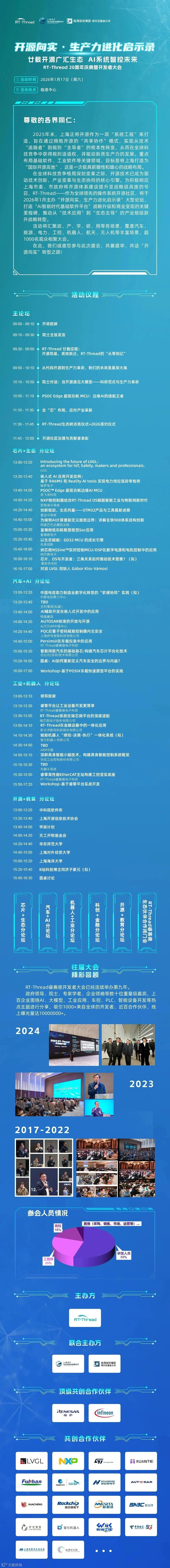 在全球科技竞争格局深刻变革之际,开源技术已成为驱动技术创新、产业变革与生态协同的核心引擎。作为嵌入式操作系统开源社区与本土核心基础软件根技术的领军者,RT-Thread睿赛德将于2026年1月17日(周六)在上海举行“RT-Thread 二十周年庆典暨开发者大会”,在庆祝二十周岁生日之际,以“开源向实”,打造“AI 智能时代基础软件平台”为核心议题,召集全球开发者、技术领导者与创新实践者共同参与此次年度规格最高、最开放和互惠互利的技术交流盛会。
