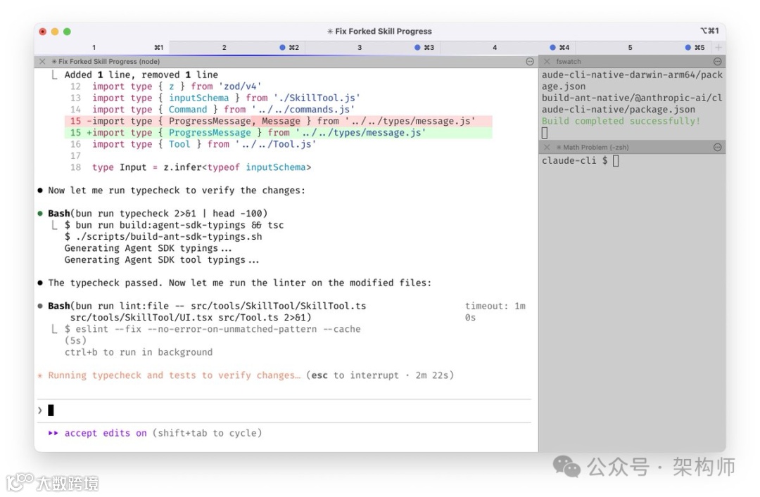 Boris在终端里同时运行5个Claude Code实例,并为标签页编号1-5。当某个Claude需要输入时,通过系统通知来获知,然后去介入。