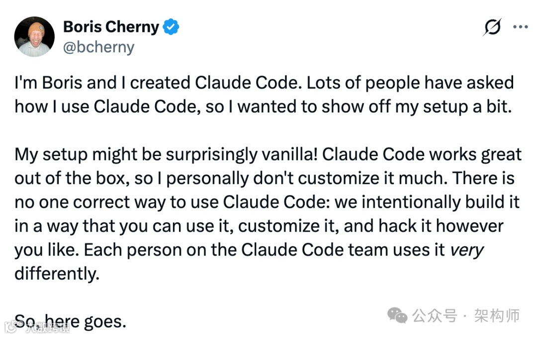 最近 Claude Code的创建者Boris Cherny在X上发了一条长帖,分享了他自己使用Claude Code的13条核心技巧。这条帖子在开发者社区疯传,阅读量已经突破600万。