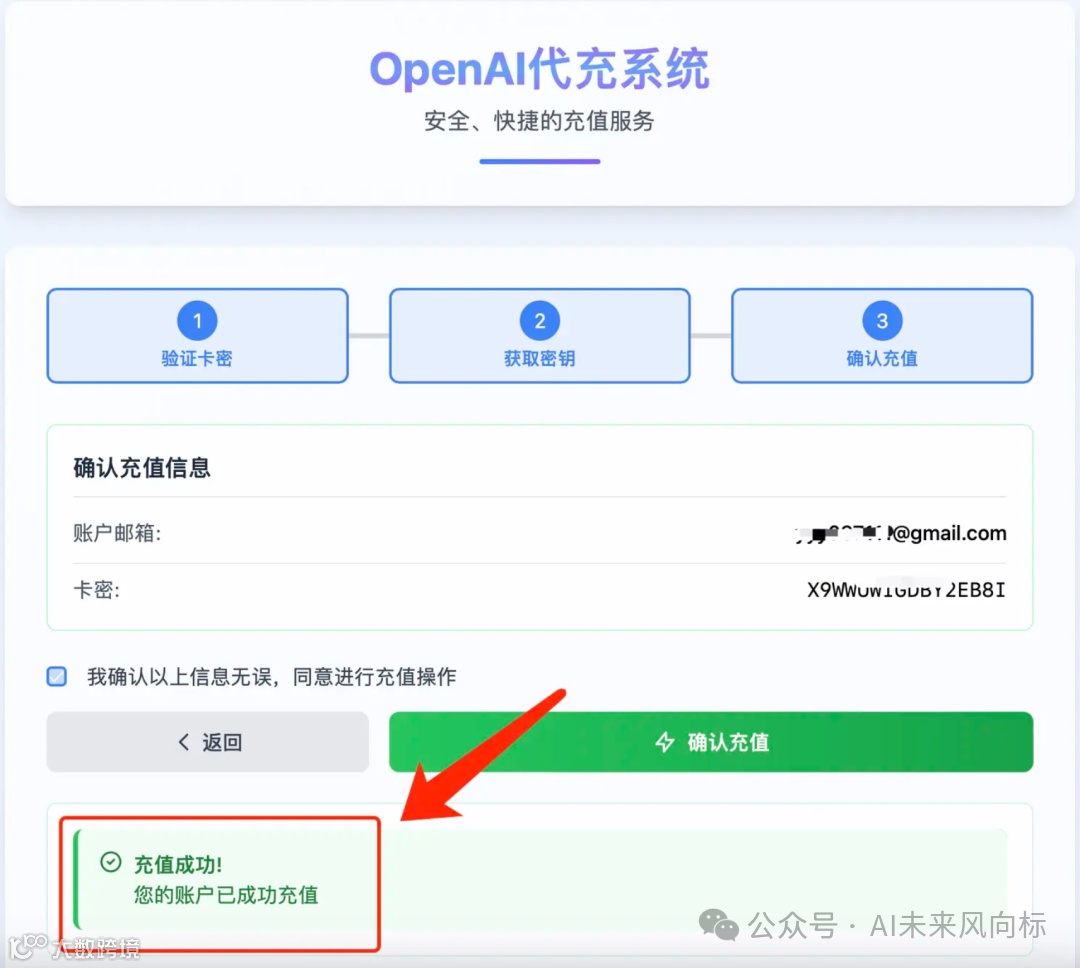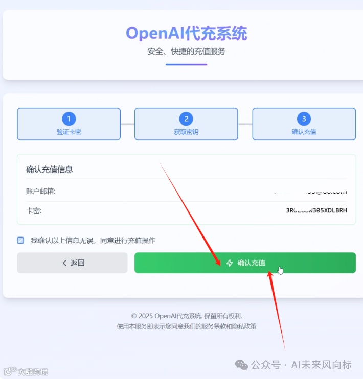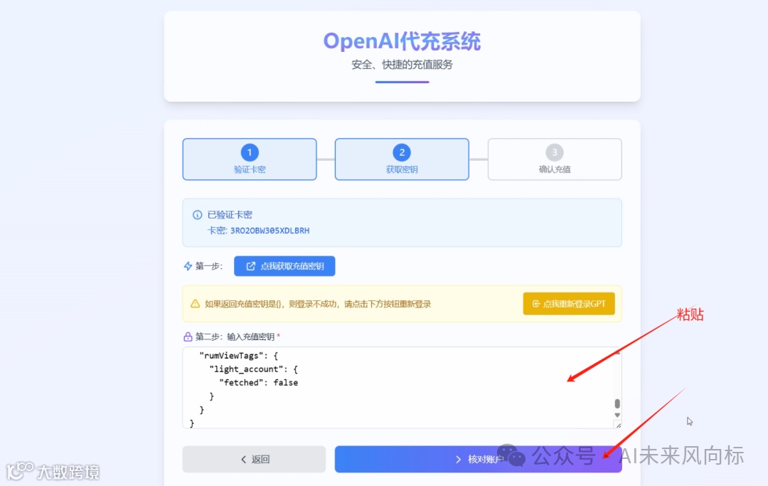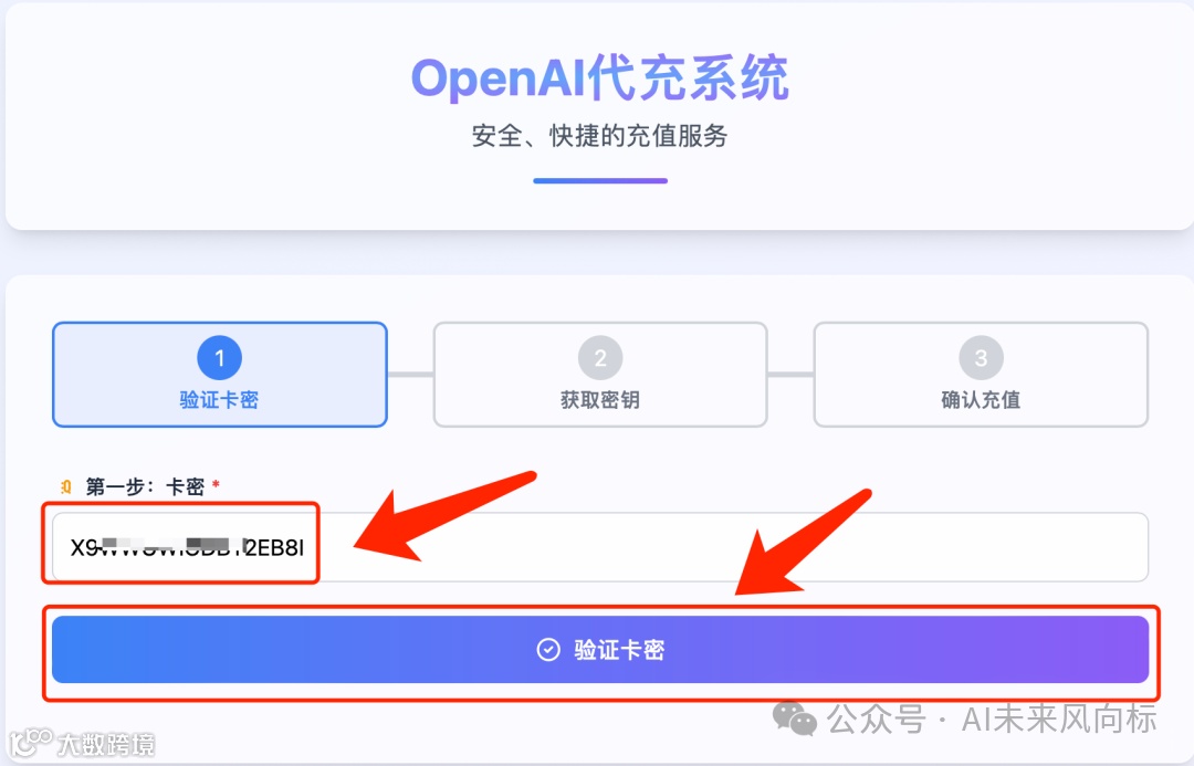 (2)点击【开始充值】之后,把刚刚买到的卡密粘贴进来验证。