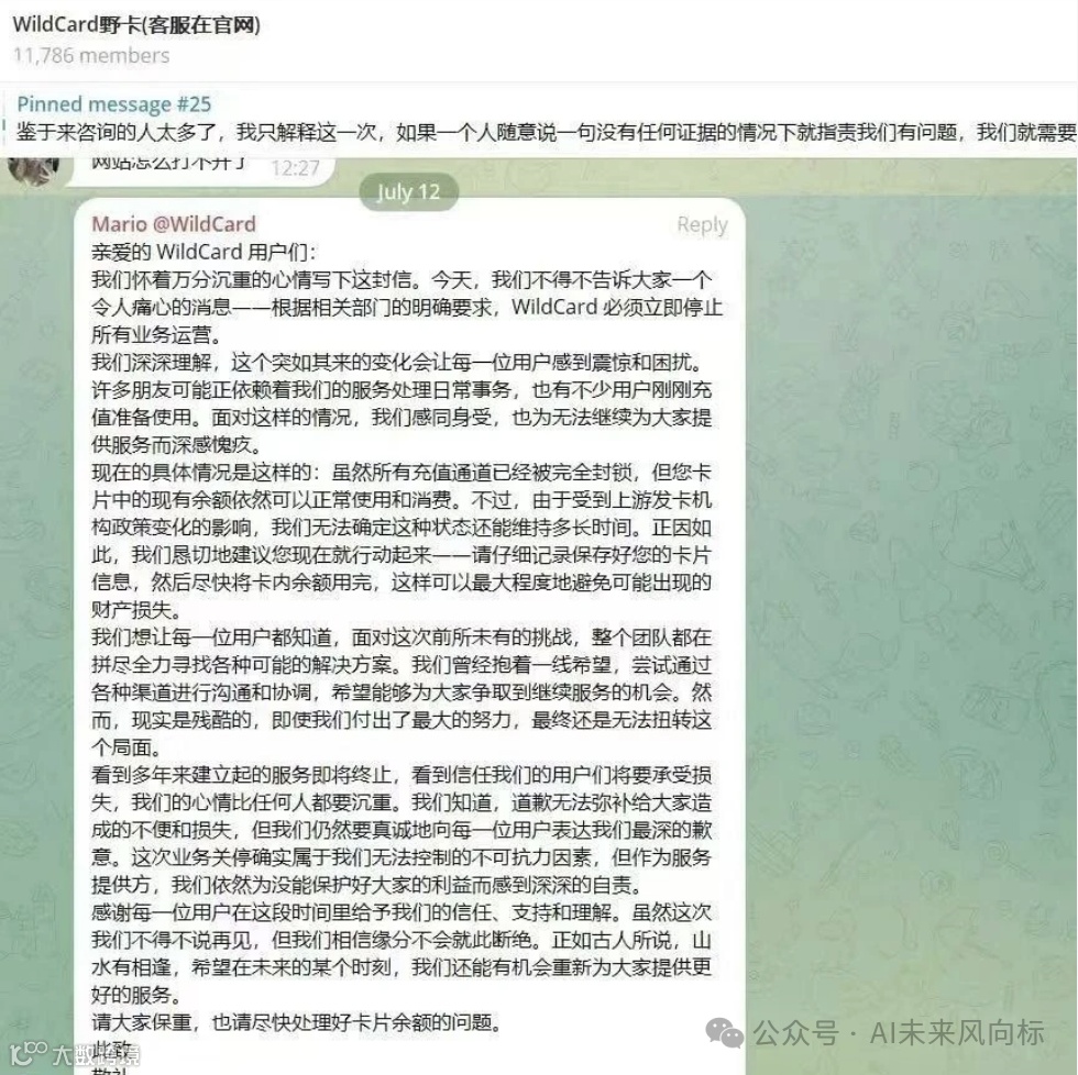 如上图所示,WildCard 跑路了,这是国内最大的充值ChatGPT虚拟卡平台了 。