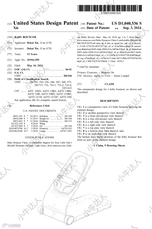 经查询,这款产品于2024年5月10日在美国进行外观专利申请的提交,于2024年9月3日获得了公告。