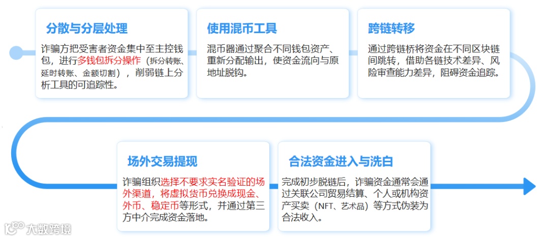 🔎涉虚拟货币电诈:完成诈骗后,犯罪团伙通常会迅速将赃款兑换为虚拟货币并转入链上,通过地址拆分、多轮转账、跨链跳转、混币等方式加速资金分散与混淆,使赃款在短时间内完全脱离受害者的可追踪范围。