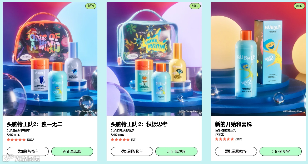前段时间,Bubble Skincare 与《头脑特工队2》联名推出全新护肤系列,结合其中角色的独特魅力推出“快乐洁面乳”、“安慰爽肤水”、“勇气保湿霜”,通过在包装上使用角色的插图,结合趣味性和品牌形象带来一次快乐、安慰与勇气的护肤之旅,让消费者感受到情感的陪伴。
