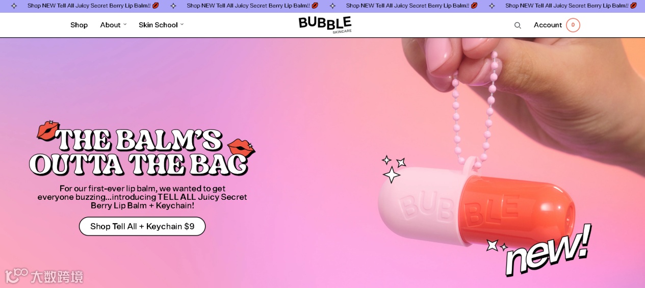 Bubble Skincare 独立站布局和设计凸显了其“快乐护肤”的理念,“产品系列”、“关于我们”、“皮肤学校”三个清晰明了的导航栏,渐变色的背景、靓丽的色彩搭配与其明亮有趣的产品包装相得益彰,传达了品牌的青春和活力,再使用对比色或互补色来突出按钮和重要信息,增强了视觉的层次感。通过色彩和设计元素,Bubble Skincare 直接表达了品牌故事和情感,让消费者在浏览网站时感受到产品的独特魅力。