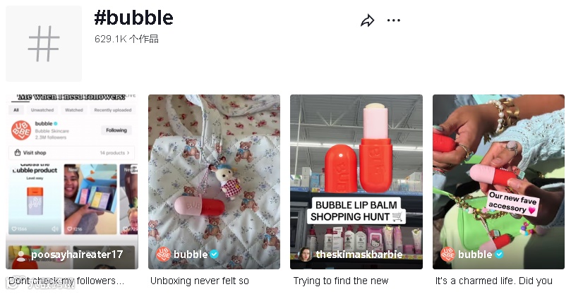 许多 Bubble Skincare 粉丝会在品牌标签下发布他们购买的产品的视频或是提供如何使用产品的技巧或窍门,截止目前,#Bubble标签下已有将近 63 万个作品。