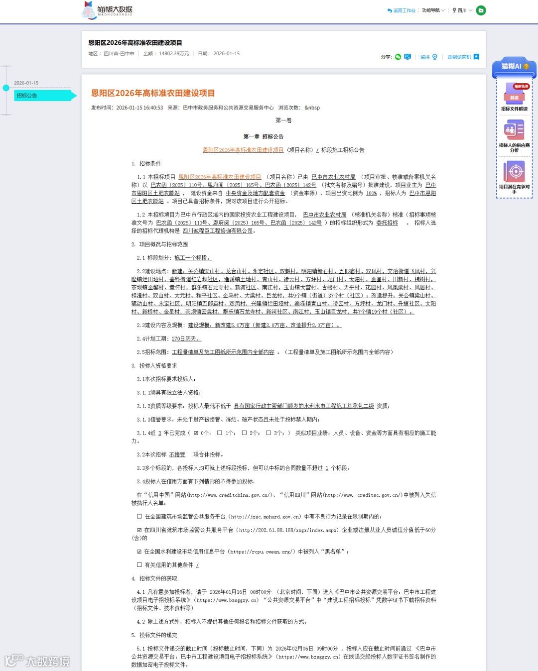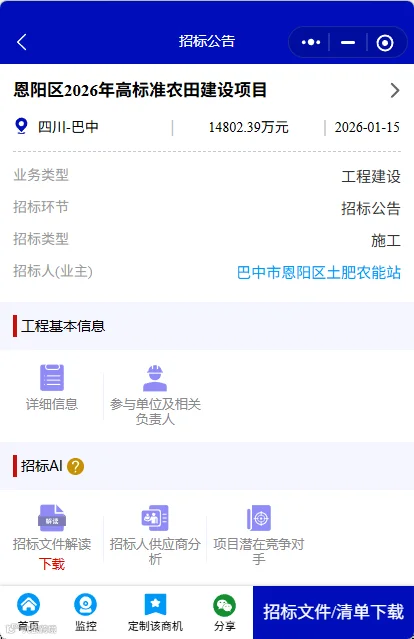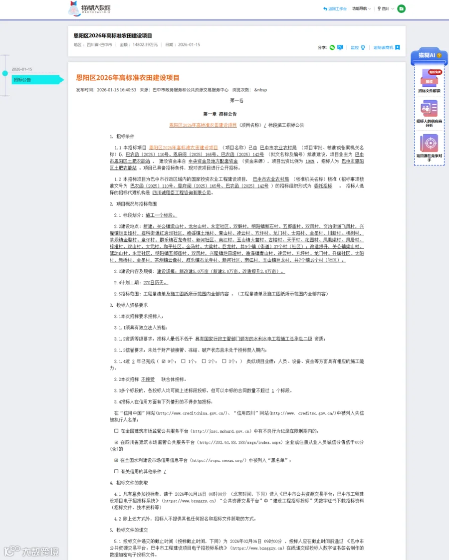 1月15日,恩阳区2026年高标准农田建设项目已获巴中市农业农村局批准建设,项目业主为巴中市恩阳区土肥农能站,建设资金全部来自中央资金及地方配套资金,项目出资比例为100%。项目已具备招标条件并通过委托招标的形式进行公开招标。本项目采用中标候选人评定分离机制确定中标人。