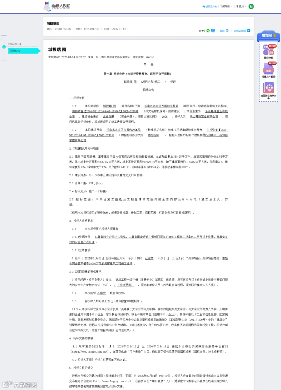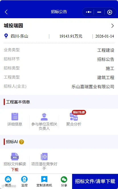 1月14日,城投瑞园项目已由乐山市市中区发展和改革局批准建设,项目业主为乐山嘉瑞置业有限公司,资金全部来自企业自筹,出资比例为100%。目前,项目已具备招标条件,并通过委托招标的形式进行公开招标。项目使用中标候选人评定分离机制确定中标人。