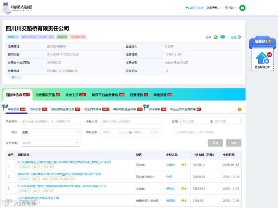 如果您想全面了解该中标人的中标记录,可以通过猫糊平台的“企业查询”来查看该企业所有的中标项目列表。