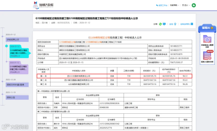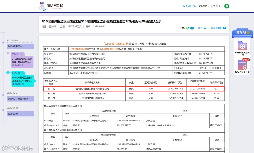 该项目两个标段均于2026年1月8日正式开标,其中:TJ1标段共有25家投标单位参与竞标,项目设定的最高限价为7.0675亿元。经过评审,四川川交路桥有限责任公司以6.635亿元的报价成功中标。施工计划工期为24个月。