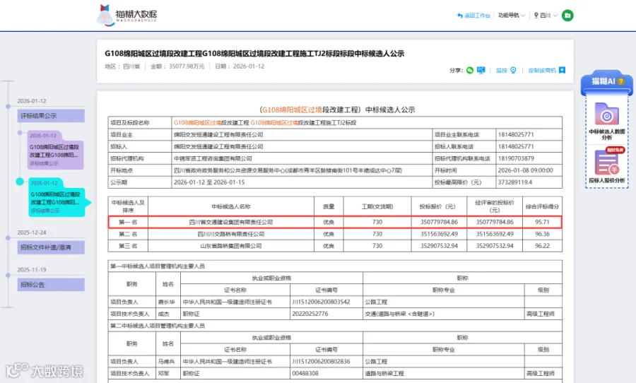 TJ2标段共有30家投标单位参与竞标,项目设定的最高限价为3.7328亿元。最终,四川省交通建设集团有限责任公司以3.5077亿元的报价成功中标。项目计划工期为24个月。