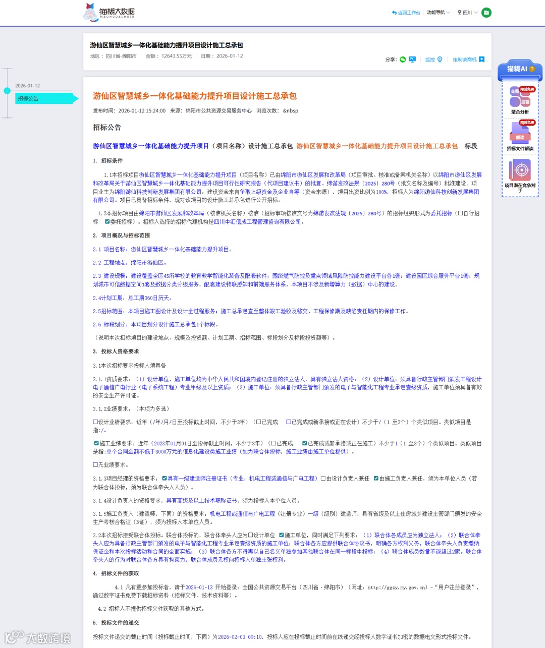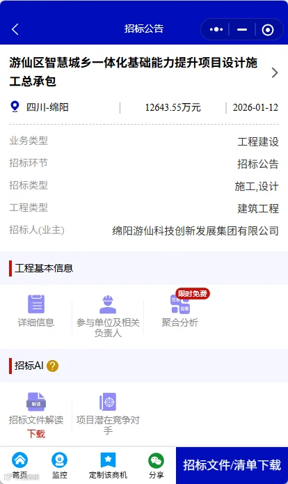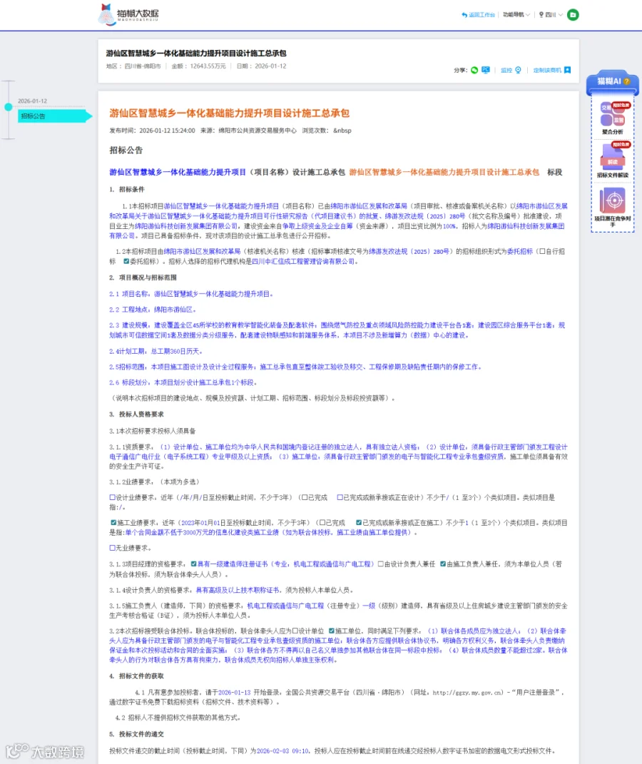 1月12日,游仙区智慧城乡一体化基础能力提升项目设计施工总承包已获绵阳市游仙区发展和改革局批准建设,项目业主为绵阳游仙科技创新发展集团有限公司,资金来源为争取上级资金及企业自筹,项目出资比例为100%。现已具备招标条件并通过公开招标的形式进行招标。