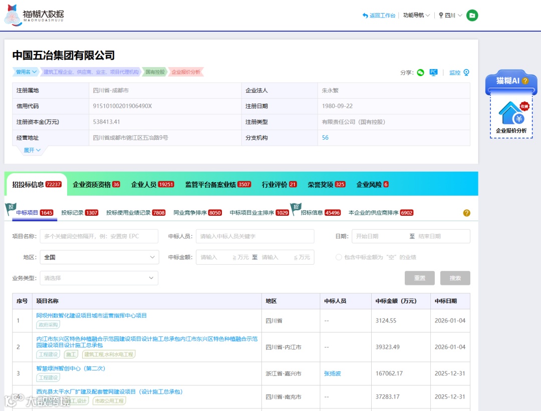 如果您想全面了解该中标人的中标记录,可以通过猫糊平台的“企业查询”来查看该企业所有的中标项目列表。
