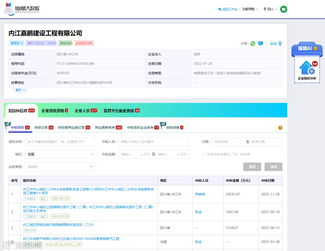如果您想全面了解该中标人的中标记录,可以通过猫糊平台的“企业查询”来查看该企业所有的中标项目列表。