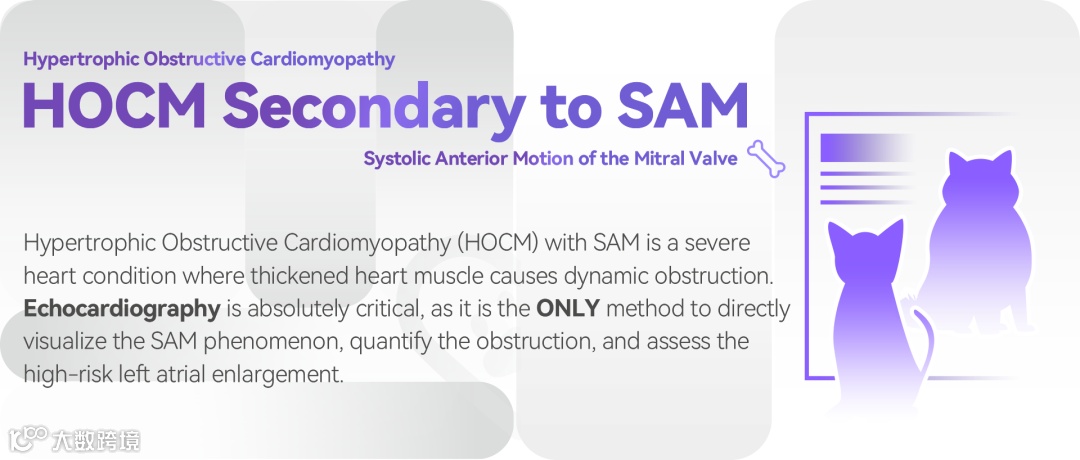 HOCM with SAM represents a dynamic and complex cardiac disease in cats. It begins with myocardial hypertrophy (often genetically mediated), then altered ventricular geometry induces SAM, leading to LVOT obstruction and mitral regurgitation. These phenomena raise left atrial pressure, cause atrial enlargement, and predispose to thromboembolism and heart failure. Echocardiography is the cornerstone for diagnosing, characterizing, and monitoring this disease — without it, HOCM/SAM may be easily missed or underestimated.