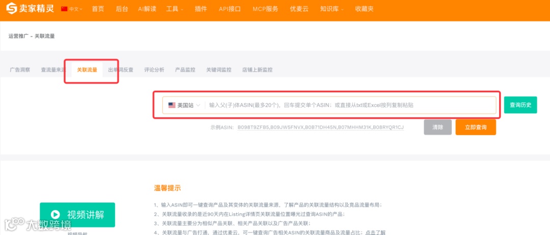 打开卖家精灵的关联流量功能,输入ASIN进行查询