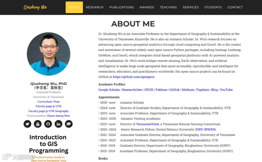 第一次看吴老师的视频,是他讲GEE遥感影像分类,他讲解细致、视频制作精良、示例代码好使,能感到他对这份事业的热情。更重要的是,他是众多开源Python库的维护者,推广者,致力于惠及全球的研究人员、教育工作者和从业人员。
