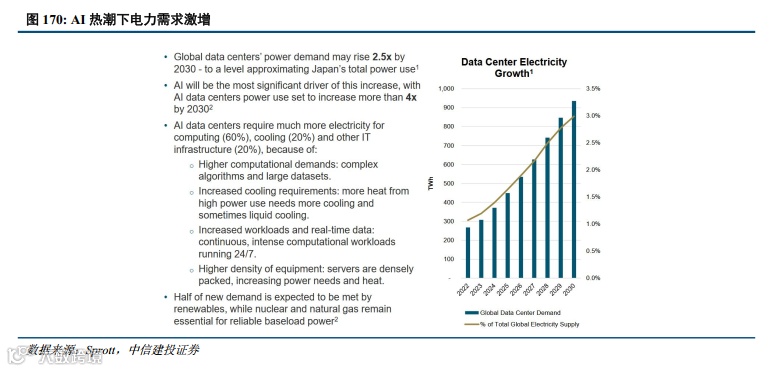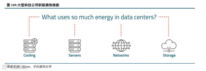 AI热潮下电力需求激增,大型科技公司积极拥抱核能:人工智能时代到来,数据中心承载海量算力,其电力消耗增长已成必然趋势。小型模块化反应堆(SMR)具有全天候、稳定发电以及部署灵活的优势,契合数据中心的用电、用地需求,西方科技巨头对于“AI+核电”的合作模式已基本达成共识,正加速推动小堆的部署和技术创新。根据Sprott,预计2023年至2030年,数据中心的电力需求将激增258%,使其在全球电力消耗中所占份额从1.2%上升至4.1%。