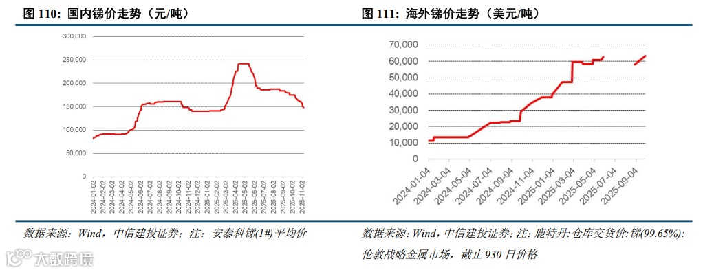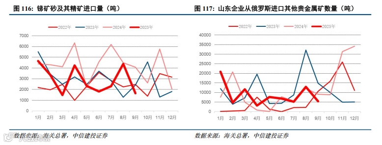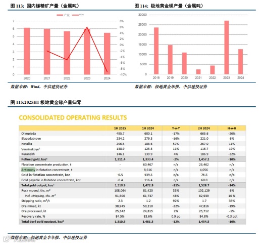 海外锑精矿供应仍需重点关注华钰矿业塔铝金业项目投产进度及俄罗斯极地黄金生产情况。除中国外,海外锑主产国主要包括俄罗斯、塔吉克斯坦、缅甸等国,其中俄罗斯锑矿生产主要由极地黄金贡献,且其产量具有较大不确定性,根据极地黄金2025中报,公司上半年生产锑0吨(2024H1产量8616吨,H2产量4056吨)。公司中报表明:根据矿山计划过渡到Vostochny矿坑的下一阶段,富锑矿石生产停止(原文:In 1H 2025, no merchant gold containing flotation concentrate was produced, as antimony-rich ore production ceased with transition to the next stage of the Vostochny pit in line with the mine plan.)。极地黄金减停产或导致全球锑供给边际减量近万吨,此供给减量将无视内外价差逻辑,也就是:即使后续海外新建冶炼厂产能投产且极地黄金可以向其供货,仍然可能存在缺矿情形。塔吉克斯坦锑矿生产需重点关注塔铝金业项目投产进度,该项目为未来几年全球主要供给增量。