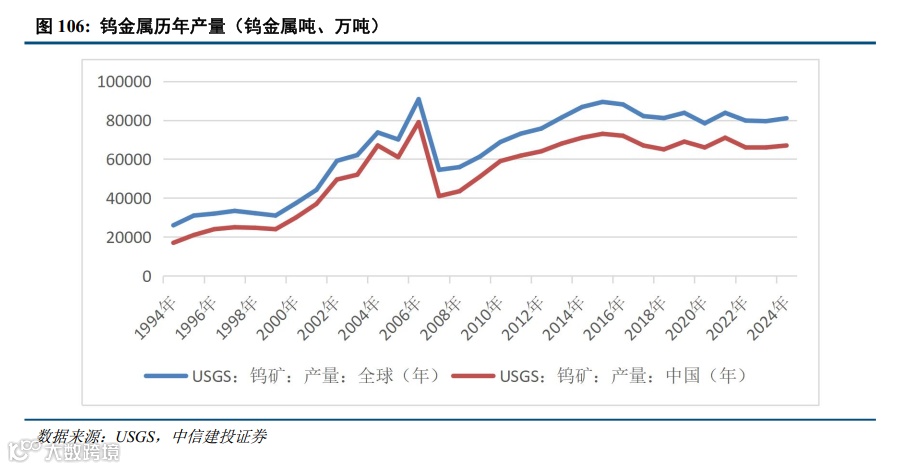2024年全球钨精矿产量约8.1万吨(金属量),其中中国产量6.7万吨,占全球81.48%。2024年,全球钨储量预计460万吨,其中中国钨储量最高240万吨,占全球总储量的52 %。20世纪90年代,钨精矿价格下行周期中,海外高成本钨矿大面积关停,中国钨精矿占比显著提升,此后三四十年中,中国始终占据全球钨精矿供应的核心地位。
