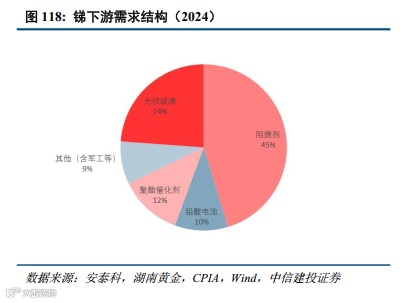 锑的下游应用主要集中于阻燃剂、玻璃陶瓷、铅酸蓄电池、聚酯催化和军工等领域。根据安泰科数据,2021年中国锑行业下游需求结构中,阻燃剂占比55%,铅酸电池占比15%,聚酯催化占比15%,玻璃陶瓷占比10%。近年来,伴随全球光伏装机高速增长及阻燃剂需求萎缩,锑下游需求结构已发生较为明显变化,根据我们测算,2024年锑下游需求中,阻燃剂占比已下降至45%,光伏玻璃占比已快速提升至24%(2019年占比仅5%)。