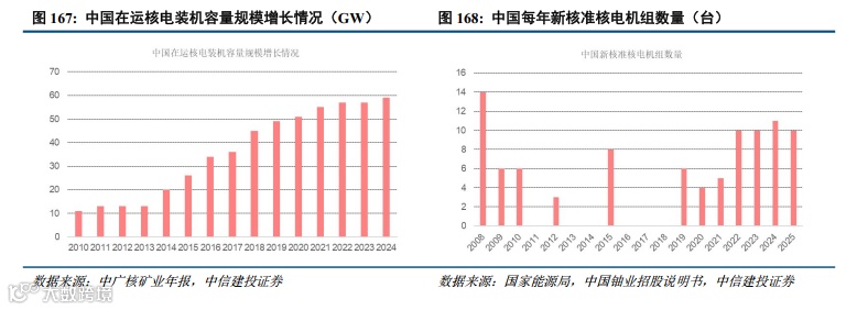 中国将成为未来全球核电装机增长主力:根据中国核能行业协会数据,截至2024年底,中国大陆在运核电机组共57台,额定装机容量59.4GW;在建机组27台,在建规模继续保持世界第一。2024年中国共有2台核电机组并网发电,6台核电机组开工建设。2025年,我国将核准开工一批条件成熟的沿海核电项目,稳步推进在建核电工程建设,建成“国和一号”示范工程等机组,预计到2025年底,在运核电装机将达到65GW。
