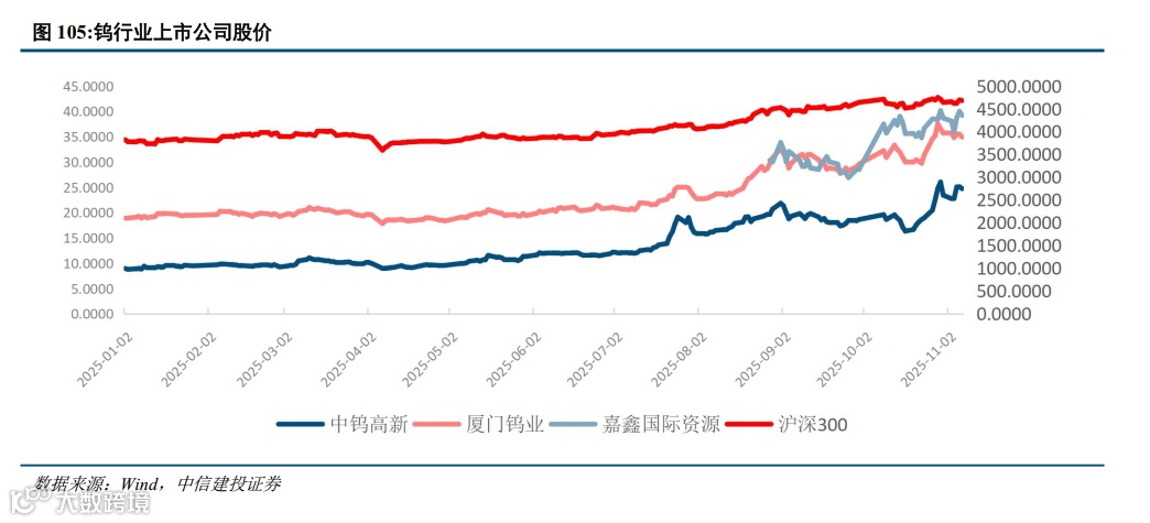 钨行业主要上市公司股价表现大幅跑赢沪深300,中钨高新年初至今涨幅176%,体外柿竹园、远景钨业逐步公告注入上市公司体内。厦门钨业年初至今涨幅85%,钨、稀土、新材料三大主业共振。港股佳鑫国际资源年内8月28日上市,涨幅29%,按照发售价计算,涨幅则已经达到359%,对应的资产为哈萨克斯坦的巴库塔钨矿。