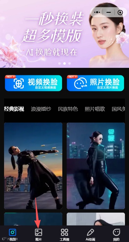 1、打开小程序:AI换脸视频照片神器,点击下方「图片」