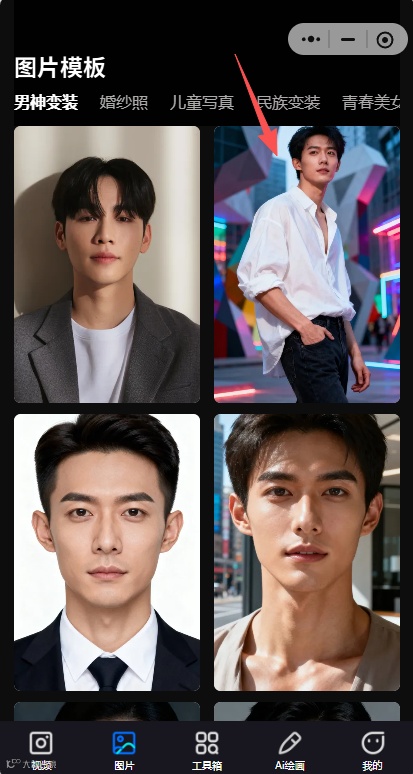 2、可以看到有各种风格的模版,点击「男神变装」,选择一个自己喜欢的模版