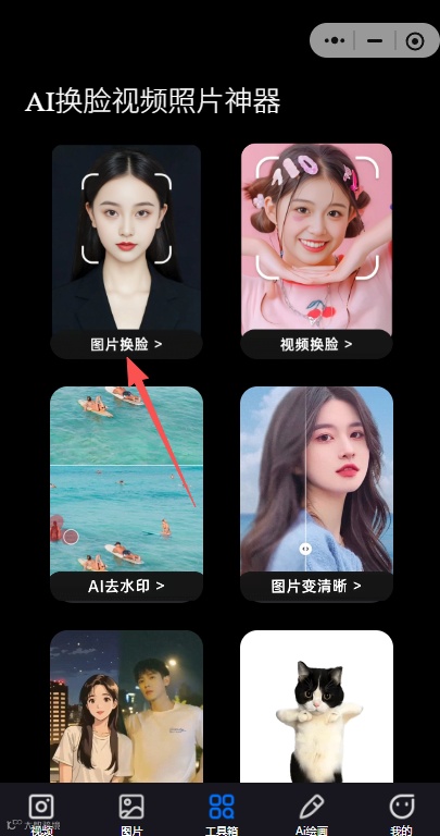 1、打开小程序:AI换脸视频照片神器,点击下方「工具箱」