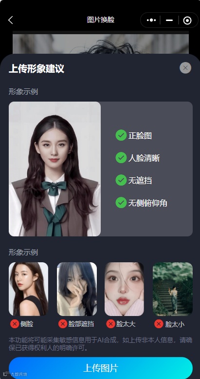 打开“AI换脸视频照片神器”→上传模版照片→再上传正脸照片→