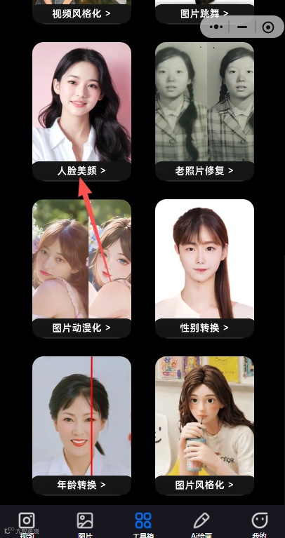 1、打开小程序:AI换脸视频照片神器,点击下方「工具箱」