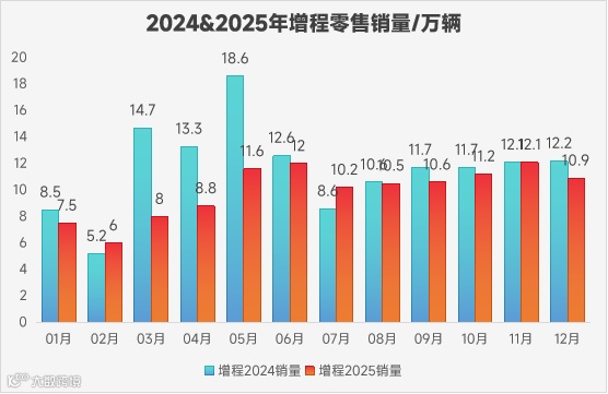 增程式市场则面临着更为复杂的竞争环境。2025 年增程式车型占比为 9.4%,同比增长 0.8%,但零售量环比下降 6%。尽管问界 M9、理想 L9 等车型依然保持较高热度,但随着纯电续航里程的不断提升和充电网络的日益完善,增程式车型的市场空间受到一定挤压,未来发展或将面临更大挑战。