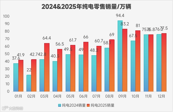 在纯电市场,2025 年全年累计批发销量达到 1531.9 万辆,同比增长 25.2%,展现出强大的发展韧性。11 月纯电动零售量为 82.7 万辆,同比增长 9%,环比增长 2%,尽管 12 月受季节性因素影响销量环比有所下降,但全年增长势头未改。这一成绩的取得,既得益于电池技术的持续进步带来的续航里程提升,也离不开充电基础设施的日益完善。