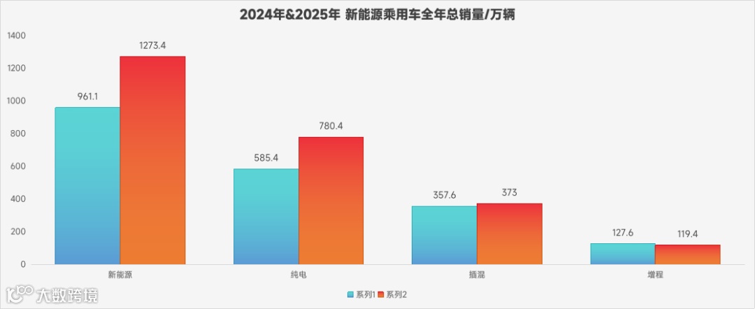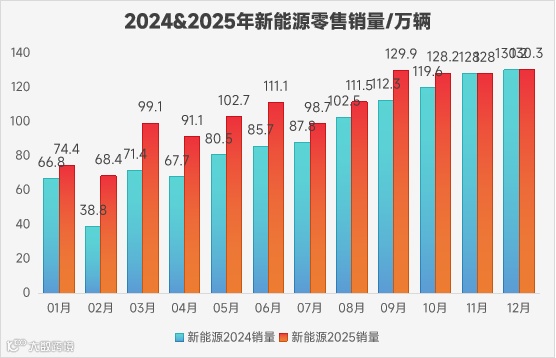在政策引导与市场需求的双重作用下,中国新能源汽车市场在 2025 年延续了爆发式增长。全年新能源乘用车零售量突破千万辆大关,达到 1273.4 万辆,环比增长 32%,这一数字不仅刷新了历史纪录,更标志着新能源汽车全面普及的拐点已经到来。