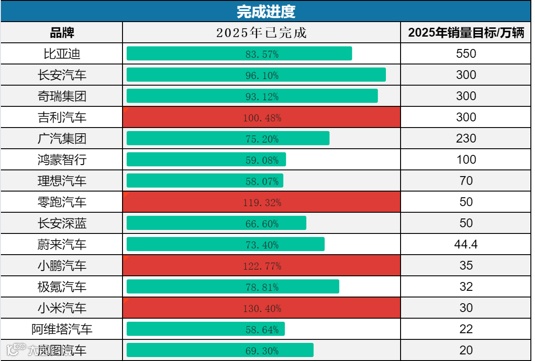 在销量目标完成度方面,不同车企呈现出明显分化。小米、小鹏等新势力品牌凭借精准的市场定位和快速的产品迭代,成功实现销量目标超额完成,而部分传统车企则面临转型压力,销量目标完成度相对较低。这一差距不仅反映出企业在战略决策和执行能力上的差异,也预示着行业淘汰赛的加速到来。