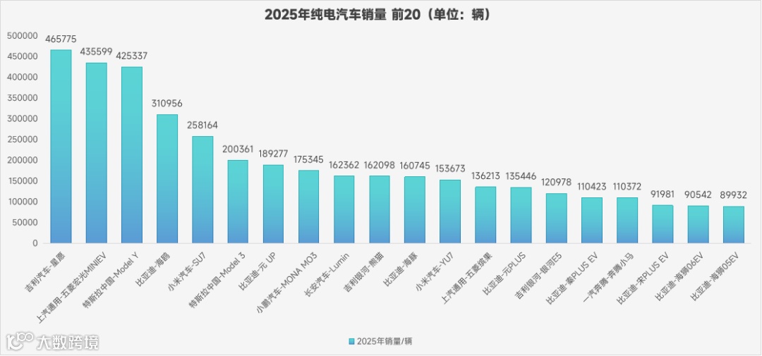 从车型表现来看,纯电市场呈现出明显的头部效应。在 2025 年纯电车型销量 TOP20 榜单中,特斯拉 Model Y 以 465,775 辆的成绩位居榜首,比亚迪海豚、元 PLUS 等车型也表现优异,成功跻身第一梯队。这一格局反映出消费者对主流品牌和成熟车型的高度认可,同时也意味着新势力品牌需要在产品力和品牌力上持续突破才能突围。