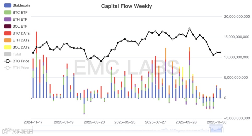 12月1日,美联储停止QT并通过临时回购(Repo)提供约165亿美元短期流动性。美国财政部做了两次美债“回购”,合计 145 亿美元。这稍微缓解了市场短期流动性,但尚不足以对BTC这类高β资产形成流入促进。
