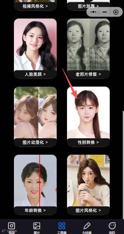 首先,打开AI换脸视频照片神器小程序,点击下方“工具箱”,再点击“性别转换”,接着点击“加号”,上传一张你要性别转换的照片;点击“性别转换”,选择你要改变的性别;点击“开始换脸”,等待处理成功;成功之后,就可以点击“保存”,去可以在相册里查看啦。