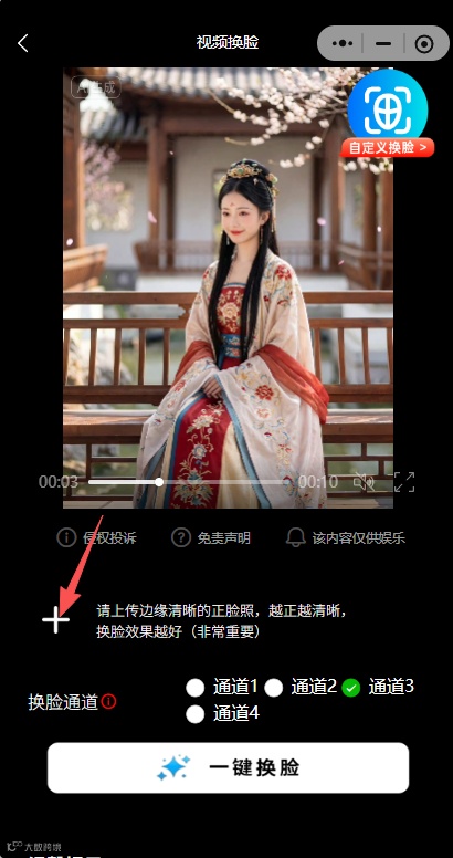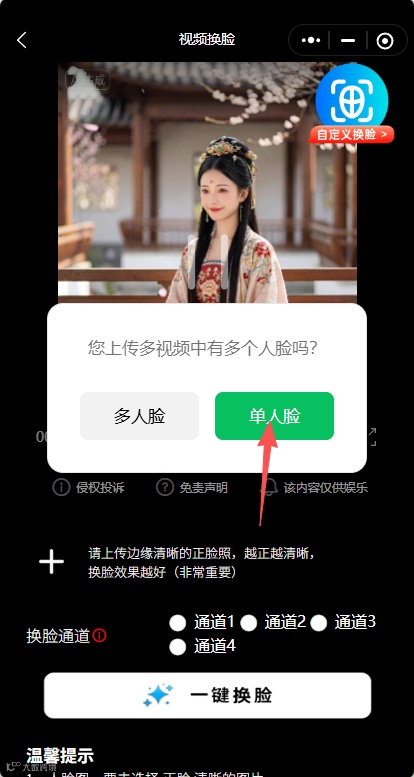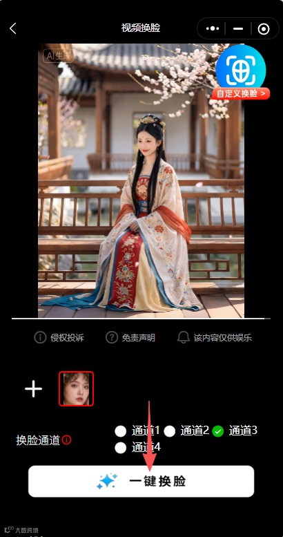 选择通道→一键换脸→保存分享!