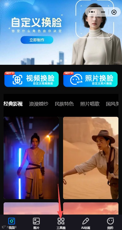1、打开小程序:AI换脸视频照片神器,点击下方「工具箱」