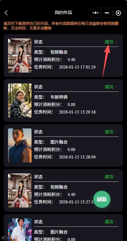 8、进去之后,能够看到作品状态,成功之后可以进行查看,没问题点击保存,视频就直接保存到相册里了