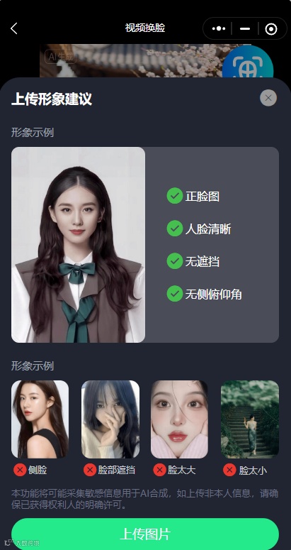 打开“AI换脸视频照片神器”→上传模版视频→再上传正脸照片→