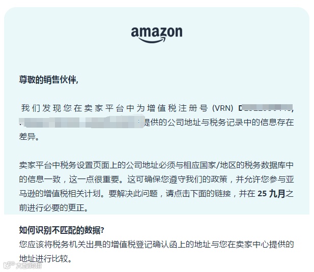 亚马逊明确要求:卖家平台中与增值税登记号相关的地址,必须与以下任意地址之一保持一致: