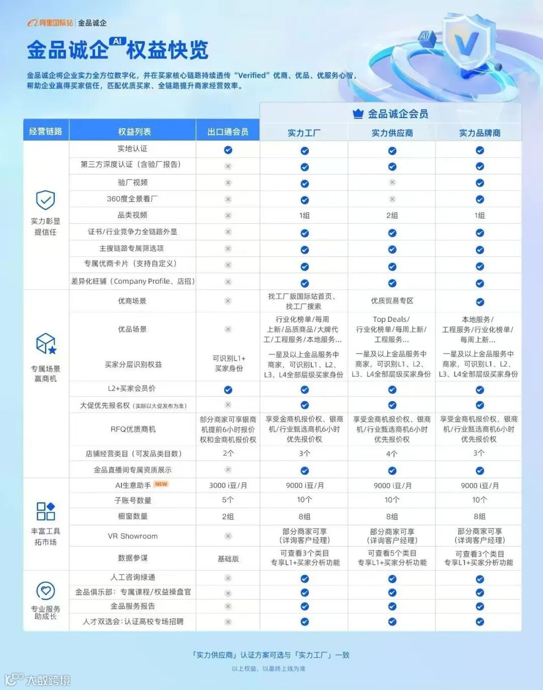 ■ 金品诚企AI版 Verified Supplier 90000元/年高级会员方案,享有优质商机推荐、流量倾斜、验厂认证、更多橱窗展示等权益。通过“Verified”标识传递企业实力,增强买家信任,提升转化率。