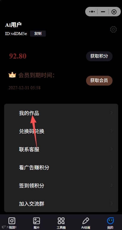 7、点击下方「我的」,再点击「我的作品」