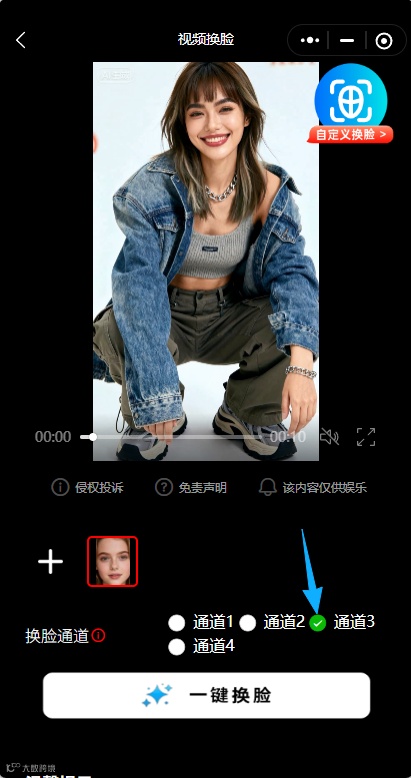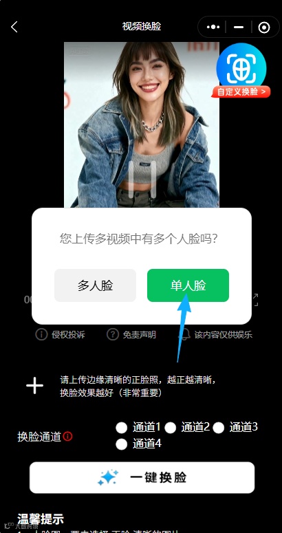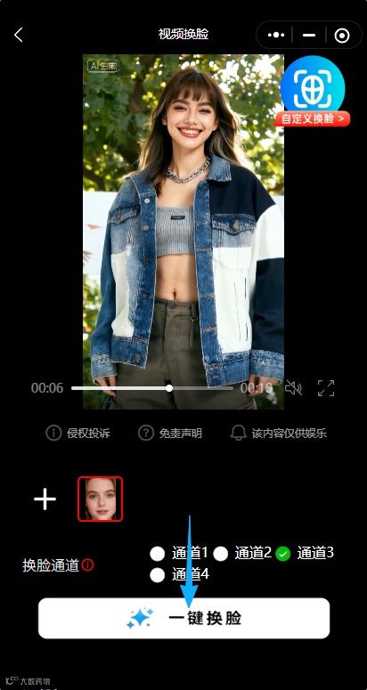 选择通道→一键换脸→保存分享!