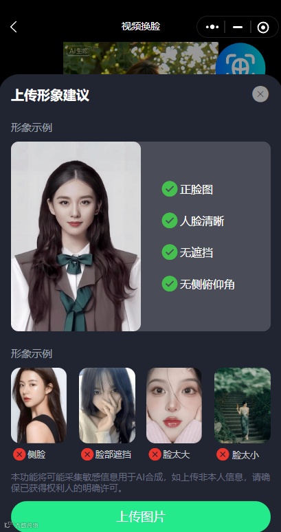 打开“AI换脸视频照片神器”→上传模版视频→再上传正脸照片→
