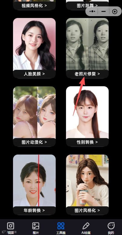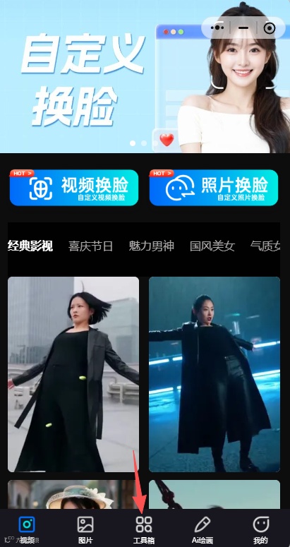 1、打开小程序:AI换脸视频照片神器,点击下方「工具箱」